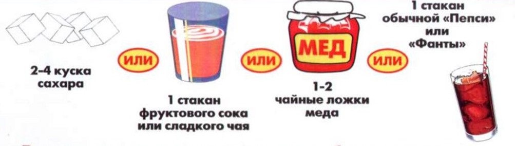 Для лечения гипогликемии следует срочно выпить 1 стакан фруктового сока либо газированного напитка на сахаре, или съесть 2–4 кусочка сахара по 5 граммов, или принять 3–4 таблетки глюкозы по 4 грамма. Эти продукты всегда должны быть у ребенка в портфеле, в сумке или в кармане!