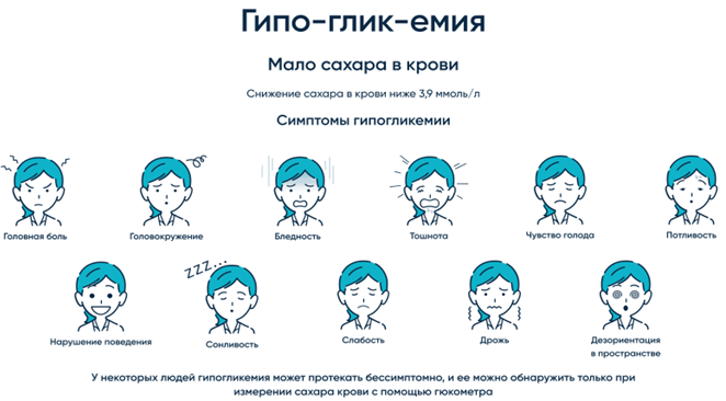 Гипогликемией называется снижении уровня сахара крови ниже 4 ммоль/л. Сокращенно гипогликемию называют «гипо». Учитель также должен уметь распознавать эти признаки, особенно у младших школьников. Основными симптомами «гипо» чаще всего являются: